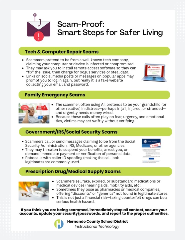 · Jesse Diaz and the Academic Services team from Hernando County Schools offered an overview of the district’s communication platforms and practical ways grandparents can be aware Artificial Intelligence (AI) and online scams. CLICK FOR PRESENTATION, HCS COMMUNICATIONS FLYER, SCAM-PROOF HANDOUT