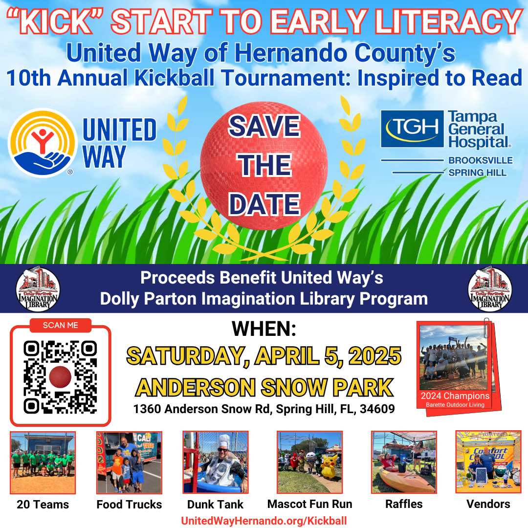 - PURPOSE: United Way of Hernando County's Kickball Tournament's purpose is to support early literacy and continue to provide Hernando preschool children free books to help them grow their little library and prepare them for kindergarten. All proceeds from this tournament will benefit United Way’s Dolly Parton Imagination Library (DPIL) program, currently providing over 1,100 Hernando children with a free book every month from birth to age five.